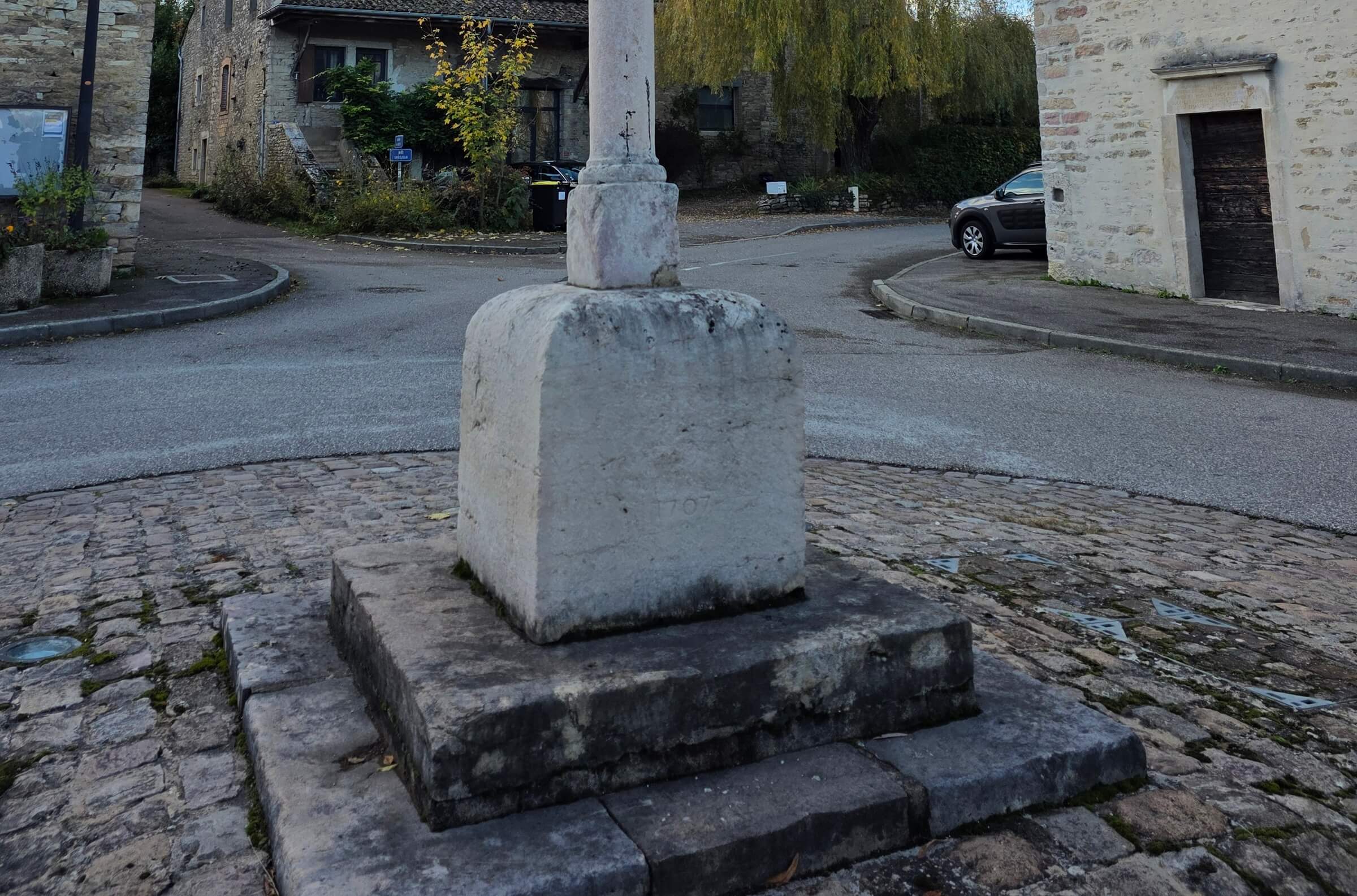 Viel Moulin Cross is situated in the middle of a paved roundabout, near the wash house and the fountain of this district. This cross was erecte ind 1707 and was rebuilt in 1818. The stone base is engraved on two sides "1707" - "Rebuilt by the care of Louis Mugnier and Anne Monin his wife owners at the Mill in 1818". The building is surmounted by an extremely simple metal cross.